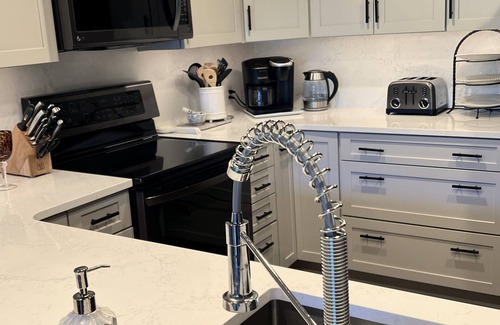 • gourmet kitchen with granite counters, wine glasses, cookware, slower cooker roasting pot, keurig coffee maker and all the extra touches to cook a special meal including spices, serving platters and utensils