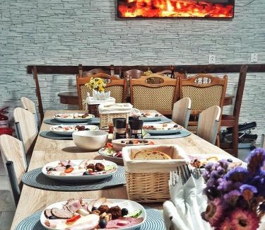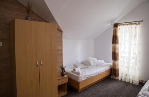 Dor de Munte Straja in Lupeni provides accommodations with an open-air bath and a shared lounge. The guest house features a sauna and room service. Every unit is equipped with a private bathroom and a hair dryer, and some units at the guest house have a terrace. The rooms are equipped with heating facilities. Buffet and continental breakfast options with local specialities, fruit, and cheese are available. Guests are welcome to eat at the on-site family-friendly restaurant, which is open for dinner, lunch, and cocktails. During the colder months, guests can enjoy winter sports in the surrounding area. For guests with children, the guest house provides outdoor play equipment. Sibiu International Airport is 119 miles from the property..