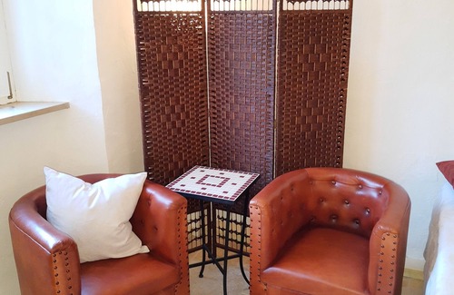 large, high, double vaulted hall, bright and friendly Two windows over the garden of the pension. Heated in winter with a tiled stove. The room, with a stone floor in travertine, its wall decoration and its high quality furniture and indirect lighting, is said to add a splendor to the Cross - Sergeant Room, which takes into account the centuries of history of this room and yet offers all the necessary modern comforts to make your stay unforgettable Experience makes.