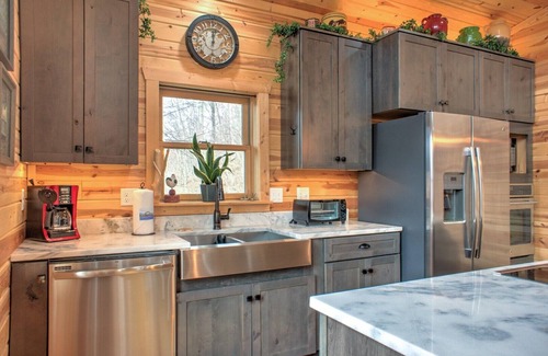 high up in the scenic mountains of pisgah national forest, double your fun gives you that authentic appalachian character without having to rough it! this modern log cabin, located in a private community with tennis courts and a pool, features fantastic long-range views and, true to its name, double living areas for your group to enjoy On a chilly day, you will love the warmth of the stone fireplace and the ambiance of the cabin's classic decor. Drum up some friendly competition with Double Your Fun's ping pong and foosball tables. The fully equipped kitchen has everything you will need to cook homestyle meals, or maybe you'd prefer dining al fresco during sunset. At any time of day, you shall find yourself drawn to relax to the peaceful sounds of the forest from a rocker on the cabin's large wrap-around deck. There is a lot of space at Double Your Fun with a loft bedroom that is big enough for adults and a lower level that includes a playful den area and a kitchenette. The main level primary suite is easy to access from the driveway and the attached shower offers a handrail. Spend your days exploring the Blue Ridge Mountains with a hike on the nature trail just up the road (it connects to the Appalachian Trail!), or hike to the top of Big Bald Mountain, where you'll find one of the most spectacular views on the East Coast. The kids (and young-at-heart) will love the outdoor adventures and rocky creeks, as well as swimming in the community pool (In Season) and exploring the playground at the Wolf Laurel village. no matter how you add it up, double your fun is hands-down a best-choice option among western north carolina vacation rentals!