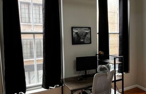 - bedroom #1: king-sized bed, workstation with monitor, wireless keyboard, mouse, and smart tv Bright and sunny with blackout shades, facing Maiden Lane.