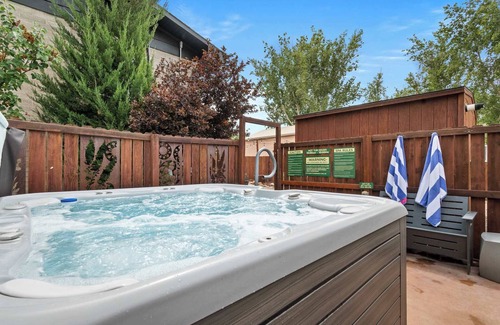 cheerful condo close to main st but away from the noise Comfortable and cozy bedding and furniture with an unbeatable location. Second level Purple Sage Flats 8 gives you access to a cool outdoor space complete with fire pit, hot tub and grill with outdoor seating.