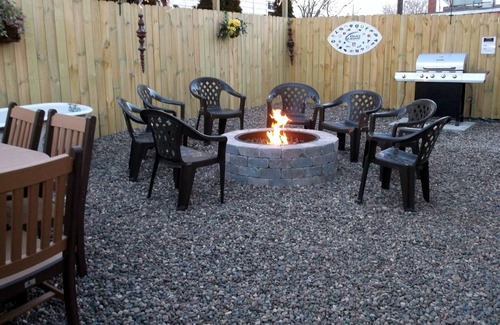 there are multiple gathering areas throughout the home, which can easily seat your guests There is a gas grill on the outside patio in the backyard along with a fire pit and seating for your party.