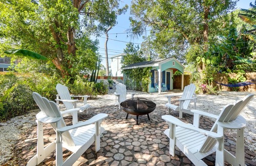 outdoor amenities: furnished screened porch, back patio w/ hammock, dining set & gas grill, wood-burning fire pit w/ adirondack chairs, porch swing, cornhole set, tropical landscaping
