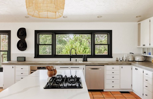 experience the unique appeal of hill country painter's studio, a former art studio transformed into a stylish retreat The studio features a loft bedroom and a full bathroom, comfortably accommodating up to two guests. The living area boasts a leather sofa and a Smart TV, complemented by high ceilings and wooden floors. The well-equipped kitchen includes a fridge, dishwasher, induction hot pad, and toaster oven (note: there is no traditional oven), with a dining area that seats two. The loft bedroom features a king-size bed, while the bathroom showcases a single sink and a stunning emerald green subway-tiled shower.