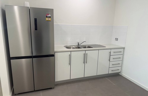 open plan kitchen with fridge/freezer, dishwasher, microwave, electric oven with ceramic cook top, toaster, kettle, air fryer, slow cooker, sandwich press, blender, island bench