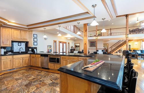 the eagle's nest is the largest private vacation rental home in the areawith its extraordinary 12,000-square-foot interior It is one of the most exclusive and sought-after premier vacation rental properties in Galena. It is a one-of-a-kind "must-see/must-stay" property. As you enter the great room on the main level, you immediately feel the spaciousness and luxury. The floor-to-ceiling windows provide natural lighting and panoramic views of our surrounding wooded acreage. The great room's focal point is the floor-to-ceiling limestone wood-burning fireplace(wood supplied). The warmth of leather furniture surrounds it, as well as sizeable distinctive area rugs and natural hickory hardwood floors. To the left is an intimate library nook. The main level has an open-concept floor plan with twin dining tables(seating for 16)and a fully equipped gourmet kitchen. The L-shaped granite counter(seat 12)is perfect for buffet-style serving. Step out onto the 115-ft. main-level wood deck(tables and seating for 16), where you will find a 52-inch gas grill. Enjoy your favorite beverage, a barbeque, and the outdoors.
