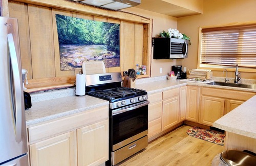 the upstairs portion offers a loft style bedroom with a king canopy bed, as well as a sleeper sofa in the living room with a wood burning fireplace lots of big windows so you can see the beautiful mountain views from every angle of the living room and kitchen!