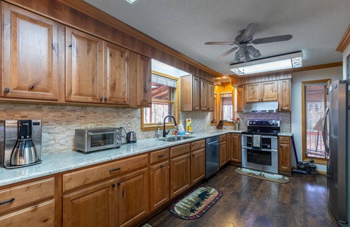 as you approach the property, you'll be greeted by the tranquil sounds of nature and the breathtaking scenery that surrounds this mountain oasis Step inside to discover a warm and inviting interior, featuring a spacious layout designed for comfort and relaxation. The heart of the home is the cozy living area, complete with a gas fireplace, perfect for gathering with family and friends on chilly evenings. Adjacent to the living area is the fully equipped kitchen, where you'll find everything you need to whip up delicious meals after a day of adventure in the mountains. the home offers a drip coffee maker so be sure to bring your favorite coffee grounds!