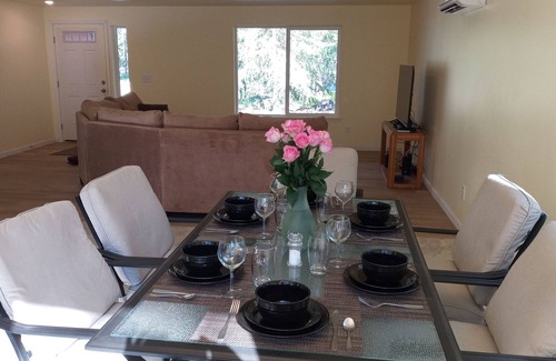 snuggle in on ample couches with a tv and dvd player Amenities include a full kitchen with granite countertops, dining room table for 6 guests, raised bar with bar stools, washer/dryer, and vinyl plank flooring throughout. The three bedrooms contain queen-size beds, and a twin AeroBed inflatable bed can be added to the Master bedroom for a 7th guest, or for those who prefer to sleep solo.