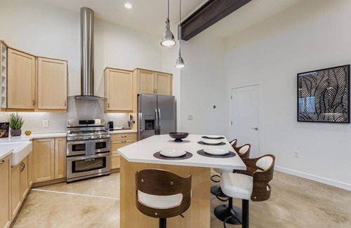 welcome to our home! experience bold design and cozy charm in this modern east austin retreat This stylish 2BR/2BA home features high ceilings, polished concrete floors, a gourmet kitchen, and plush bedrooms on separate levels for privacy. Outdoor spaces include a string-lit rooftop deck, covered patio, gated yard, and carport. Walk to bars, food trucks, and breweries, or ride minutes to Downtown, Rainey, SoCo, SXSW venues, ACL at Zilker, UT games, Moody Center, and Formula 1 at COTA.