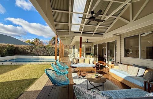 Gather your favorite travelling companions and escape to Ace Echuca - a stylish, five-bedroom retreat set in the heart of Echuca. Designed for relaxed group getaways this stylish light filled home offers a solar-heated pool and expansive alfresco deck for sunny afternoons and a cozy fireplace for winter evenings. Five bedrooms and 2.5 bathrooms give everyone space and privacy. Just a short walk from the main shopping precinct, and a relaxing stroll to the Port Cafes are the recipe for your leisurely escape.