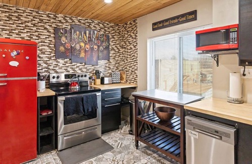 this eclectic apartment has a bright, cheery kitchen stocked full of seasonings, utensils, dishes, cookware and olive oil The kitchen has a full-sized stove & refrigerator as well as a coffee bar with a Keurig, sugar and creamer. There is a mini dishwasher as well as a microwave and a rolling bar cart that can be moved to create more counterspace while preparing a meal.