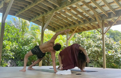 this unit has a shared garden entry and a private huge covered lanai for dining + relaxing also available on site for use are yoga mats + props and an infrared sauna!