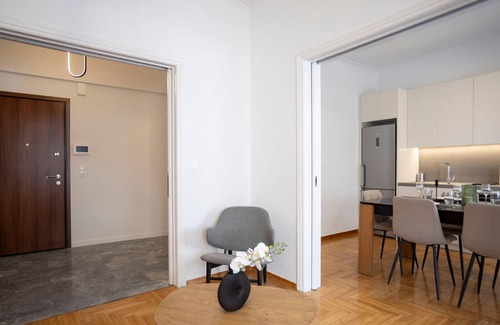 step into this elegantly designed apartment, located on the second floor of a charming building in the upscale kolonaki district Upon entering, you'll be greeted by a spacious hallway that leads to a large and airy living room, furnished with a comfy sofa—ideal for relaxing after a day of exploring the city. Adjacent to the living room is a fully equipped kitchen, perfect for preparing meals and featuring modern appliances, ample storage, and a chic design that blends style with functionality.