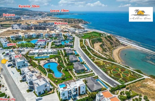 this enchanting, fully furnished apartment, within maldives holiday homes in northern cyprus, provides everything you need for a truly relaxing vacation With two bedrooms featuring comfortable queen-sized beds for a restful night's sleep, Two fully equipped bathrooms, and a spacious kitchen, your daily life is seamlessly easy and comfortable. Enjoy your meals on the lovely terrace, offering serene views of the tropical gardens.