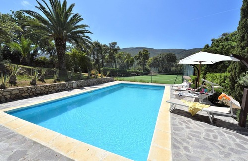the villa features a main house and a guest house, both on the ground floor The main house includes a cozy living room and a fully equipped open kitchen with modern appliances. There are two air-conditioned bedrooms and two bathrooms. Guests can enjoy a private, roofed terrace, a lush garden with sun loungers, a barbecue area, and a private swimming pool (open May to September). Additional amenities include a tennis court, table tennis, washing machine, high chair, and insect screens for comfort.