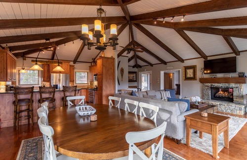 emerald escape boasts an open floor plan with beautiful views through a wall of windows overlooking the golf course where you are sure to see numerous deer during your stay The living room is spacious and offers a gas fireplace with a large flat-screen TV. On the other side of the fireplace, there is a lounge room with a card table for game night with friends and family, or the ideal work from home office. High speed internet allows for a great work from home environment.