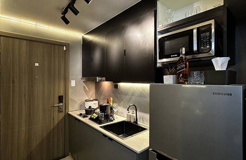 - amenities for everyday living are provided, including a samsung refrigerator, microwave, coffee capsule machine, popcorn maker, electric kettle, built-in electric stove, rice cooker, cooking utensils, samsung washing machine with spin dryer and more