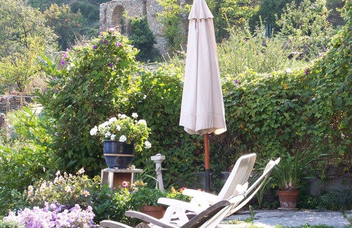from the large garden you enter a light-flooded and well-equipped kitchen, to the right a bathroom with a nice shower, toilet and sink and on the left an open bedroom join Behind it lies - in the basement - a large bedroom, the king-size bed has a new quality mattress. The apartment has a dining area with umbrella right outside the door - with great views of the valley and the sea. The large garden on two levels, which one shares with the possible tenants of Casa Amelia, invites you to relax, play games and barbecues.