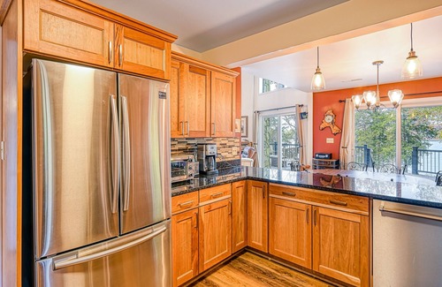 step into your little piece of lakeside paradise and be welcomed by a sun-soaked, open-concept living area complete with high ceilings, expansive windows, and sophisticated decor Snuggle up on the plush sofa to stream your favorite movies or break out the board games. Perhaps use the telescope for some nighttime stargazing! A well-appointed kitchen boasts stainless steel appliances and gleaming counter space for effortless meal preparation. Gather to share home-cooked meals and lots of laughter at the spacious dining table. Utilize the outdoor grill to cook up the catch of the day and unwind on the large furnished deck with great views of the lake. On the lower level, the main bedroom hosts a workspace, comfy linens, an en suite bath, and even more majestic views.