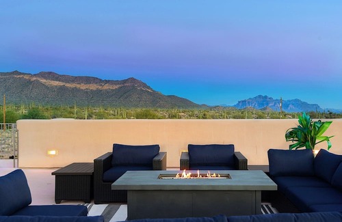 Enchantment - 7BR Spacious Luxury Estate in Mesa surrounded by Panoramic Mountain Views! Family fun and a entertainer's backyard. Sparkling pool & spa, outdoor kitchen, sun loungers, putting green, BBQ grill, basketball court. Stunning upper Rooftop patio for guests to enjoy the views. Game Room w/ ping pong, billiards table, foosball, darts and shooting hoops. Piano, theatre room w/ reclining chairs, playstation, board games and 2 arcade games.