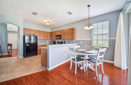 walking into the main level, you are greeted by a formal living and dining area A half bath is also located on this level. This opens up into the fully equipped kitchen and the family room, which features a breakfast nook and comfortable seating for 6-8 people as well as a large 65” flat screen TV. Sliding doors open up to the screened-in lanai, close to the kitchen and perfect for a day of grilling! All of the bedrooms are located on the second floor - the master bedroom features a walk-in closet, 50” TV, and an en-suite bathroom with large walk-in shower; an additional guest bathroom with a shower/tub combo is in the hallway.