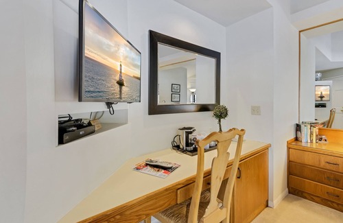 bedroom 3: one queen bed, tv, mini-fridge, full sleeper sofa, one full bathroom