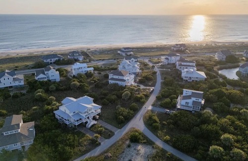 get ready to relax in this stunning, bright, open 4-bedroom, 5-full bathroom plus sunroom home featuring 2 huge wrap-around porches, 2 king beds, 1 queen bed, and a double-mattress bunk bed with double trundle Our home is perfect for a large group or two families. 4 renovated en-suite full bathrooms are equipped with linens, hair dryers and shower/bathtub in the double bunk room. All bedrooms (minus the bunk room) have sliding glass doors with access to large porches. The reverse floor plan offers 3 bedrooms with full baths and a large laundry room on the first floor; and the master bedroom with full bath and sunroom with full bath on the 2nd floor along with the kitchen, dining area, dry bar with beverage fridge and large living room. The sunroom is a separate room with doors that is ideal for kids or teens to use as a private TV or game room, or guests to use as a quiet office space. The living room opens up through double doors to a screened porch with dining table and built-in benches, a large sectional & loveseat for relaxing, reading and enjoying the expansive ocean views. The same porch has a brand new swinging bed with a full view. The entire upstairs living area enjoys beautiful sunsets over South Beach. Our home is located on a quiet street just east of Bald Head Island Club, where a full membership (including golf) is available. It is also an easy walk to beach Access 15! Shoals Club membership also available.