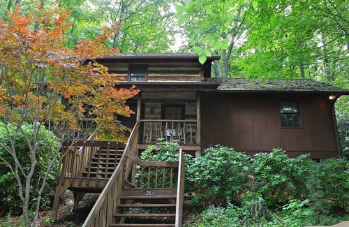 Mountain laurels surround this lovely authentic log cabin perched in a heavily wooded private area. A rushing creek can be heard from the rocking chairs on the front porch. Get away to complete stillness, yet if necessary always be in touch with Wi-Fi and cable through the flat screen TV. A full equipped stainless steel kitchen and full size washer and dryer will make the trip even more comfortable after a long day of hiking, kayaking or rafting. This is a non smoking, no pet vacation rental. The cabin has ceiling fans in all rooms but does not have central A/C.