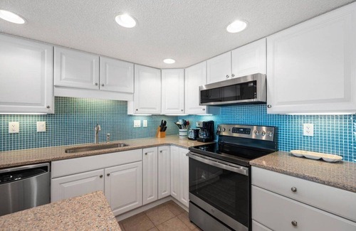 let this unit turn you into a morning person as you wake up to the waves crashing on the beach outside Once awake, grab your cup of coffee and head out to your well-sized balcony to enjoy the beautiful sunrise and plan out your fun filled day. Inside, an updated kitchen awaits with granite countertops, tile backsplash and stainless-steel appliances that is ready for all your culinary creations. The master bedroom has a huge king-sized bed and offers ocean views. The second bedroom has two queen beds. Two full bathrooms makes getting ready for your fun-filled activities easier and faster. There are flat screen TVs in the living room and each of the bedrooms and of course free Wi-Fi. There is also a large washer and dryer for guest use.