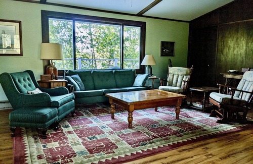 Wooded family retreat overlooking this clean, quiet lake offering spectacular sunsets, privacy, and comfortable accommodations. Perfect for entertaining family or small groups with 4 bedrooms and 2 1/2 baths, the main level has a bedroom with queen bed, another bedroom with a trundle bed and a full bathroom. The lower level has a bedroom with queen bed, a bedroom with two twin beds, one full bathroom, and a half bath. There is a bunkhouse with additional sleeping for 6 and a full bathroom. The kitchen and great room are open with views of the lake, there is a lower level family room with a wood burning stove, large 3 season porch, and deck with grill. The kitchen is fully equipped with refrigerator with ice maker, electric stove/oven, microwave, dishwasher, coffee pot, and toaster. Separate laundry room is connected to the double garage with additional bathroom and refrigerator. Cabin has electric heat and two window air conditioners on the main level. The cabin sits on a hill with approximately 15 steps down to the beach.