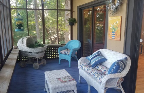 enjoy your morning coffee or hot chocolate in the rocking chairs on the outdoor deck or in the screened in porch on the comfortable wicker furniture Your choice of two other screen porches, one at entrance and one by the barbecue.