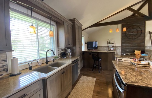 Welcome to our Chome! This former church has been converted to a beautiful, spacious 4-bedroom, 3 bath, 2 story home with 14' vaulted ceilings, massive beams, barnwood feature walls and barnwood door. Main floor has open kitchen with island and seating for 4, dining table with seating for 8, wet bar, and great room. Enjoy the 86" TV and 58" TV from anywhere in the main living area, even while playing shuffleboard.
