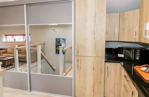 upstairs the whole area is one large light room with a kitchen at one end and dining/seating area at the other The 4 ensuite bedrooms are downstairs off the hall. It is an upside down conversion of an old coach house to make the best use of the living space.
