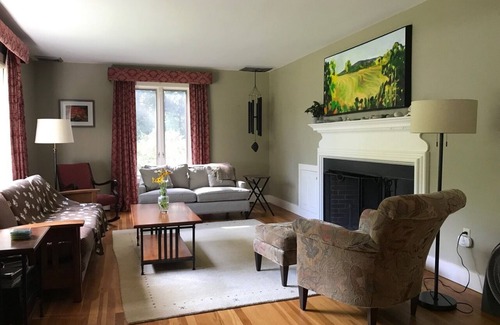 Lilac Hill offers a comfortable, one-floor house on a hill with the privacy of a secret garden and abutting conservation land with trails but only a 15-minute walk to Peterborough town center, whose amenities include restaurants, antiques & other shops, movie theater, bookstore, and more. Plentiful indoor and outdoor spaces, including open kitchen/dining room/living room with working fireplace, airy "Florida room," and large extra room with ping-pong table and third full bath. Private patio. Level 2 EV charger on premises. Close to Pack Monadnock and other great hiking opportunities..