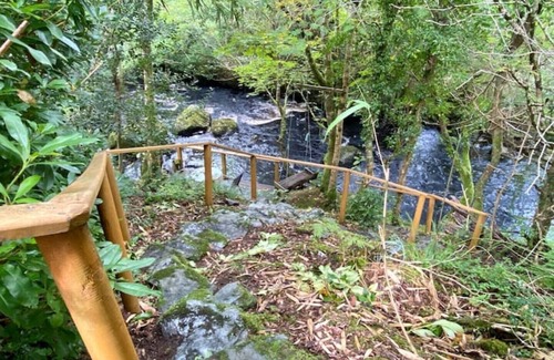 this is the first floor studio apartment in a charming hillside cottage Own door access to stairs, landing, studio apartment and own bathroom. Parking at house. Private balcony with table and chairs overlooking owners' garden. Access to private riverside decking with table and chairs. (Please note access is by rustic stone steps and care is advised.)