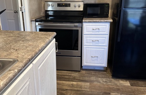 when you're not exploring the nearby attractions you can indulge in the comforts of a fully stocked kitchen, complete with stove, oven, refrigerator, and all the necessary appliances and utensils Savor your meals at the dining table, or gather around the fire pit & utilize permanent outdoor charcoal grill for a cozy evening under the stars.