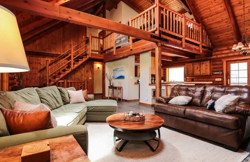 access the second floor at the top via our beautiful half log steps to a large communal area equipped with a tv (plenty of dvds), as well as two spacious bedrooms and a full bathroom