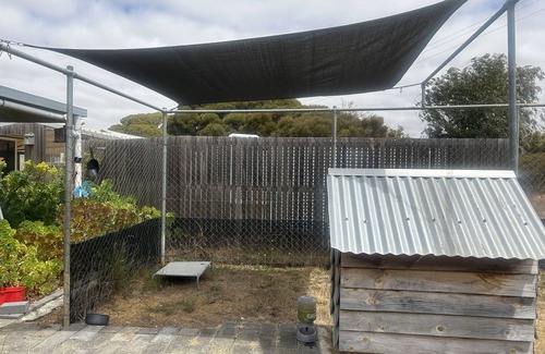 a large , secure dog run with insulated kennel and a shade sail , has been completed A small escallonia hedge ( non toxic ) gives some shade on the western side and some young fruit trees on the northern side are starting to provide shade during the summer months .