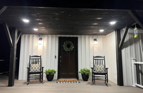 relax on the front porch adorned with idyllic rocking chairs, perfect for watching stunning sunsets or simply unwinding