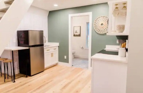 this cabin is a chic space with a fully equipped kitchen, spacious bathroom, living room, and upstairs bedroom loft The loft contains an open bedroom with a queen size bed and dresser. To access the loft, there is a steep staircase. In addition to the loft bedroom, we offer a queen pull out sofa bed located on the first level of the cabin.