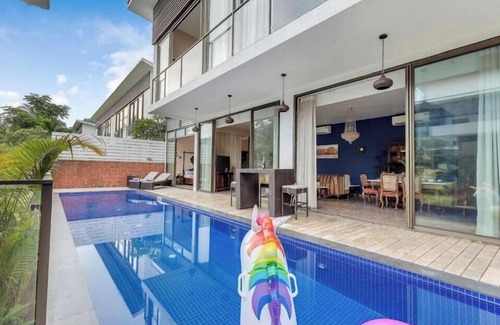 comfortable amenities: guests enjoy private check-in and check-out services, housekeeping, an indoor and outdoor play area, and free on-site parking Additional facilities include air-conditioning, a private pool, and a balcony with garden views.