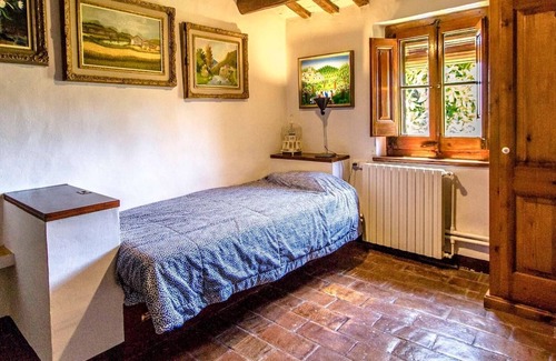 climb the stairs to the second level where you will find all the bedrooms and a spacious studio The six bedrooms welcome 10 adults and 1 child in the following arrangements: (1) one double bed, (2) one double bed, (3) two single beds, (4) two single beds, (5) one single bed, (6) one single bed. There are 4 bathrooms, plus 1 WC on the ground floor. Sizes of the beds are 100x200 cm for single bed and 130x200 cm for double bed.