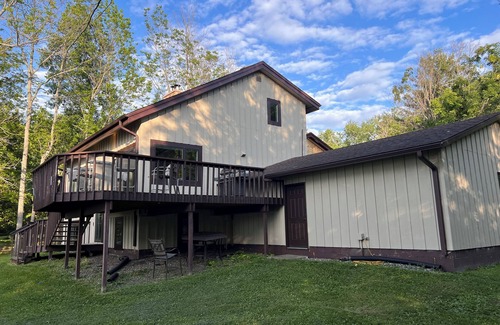 This exceptional 4-bedroom, 2.5-bathroom vacation home rests on the premier south shore of Sugar Lake, situated within just a few miles of Grand Rapids. The home has 1 bedroom on the main level, 2 bedroom in the lower level, and a master bedroom in the upstairs. The master bedroom comes furnished with a nice king-sized bed while 2 bedrooms boast queen-sized beds and the other bedroom includes twin/twin bunk beds. both of which have access to bathrooms. The basement is furnished with a ping pong table for your enjoyment. From the moment you first arrive, you’re sure to fall in love with the home’s many unique features, such as gorgeous granite countertops throughout kitchen, 25-foot vaulted ceilings, and a center island in the fully equipped kitchen to make meal preparation a breeze. Look forward to spending leisurely afternoons unwinding on the deck, which serves as an extension of the dining room areas. This deck is a great place to simply hang out with your loved ones and watch the breathtaking sunsets off Sugar Lake! If you’re in the mood to dine outdoors, whip up some delicious barbeque on the grill and enjoy your fare on the patio table. All the other essential comforts of home you need to feel as relaxed as possible during your stay are here, including air conditioning, laundry machines, TVs, DVD player, and complimentary wireless internet access for your convenience..