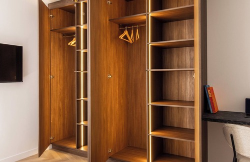 immerse yourself in luxury in this spacious, light-filled bedroom Every detail is curated for a unique experience: custom-built closets with integrated lighting for a touch of elegance, a plush double bed, and a discreetly integrated television for your relaxation. The wooden headboard perfectly complements the bespoke storage design.