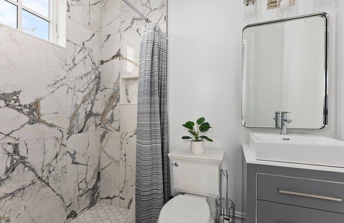 this exceptional property has three, second-floor bedrooms, with ensuite bathrooms and a fourth bedroom with built-in bunk beds across from a hall bath The majestic second floor master suite with a King bed overlooking the bay, includes an ensuite with an oversized 72? vanity and a dual function shower with bay views. Together, all the bedrooms can accommodate up to fourteen family and friends on a Stone Harbor vacation.