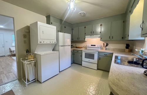 discover a fully stocked kitchen that will impress any home chef with perks like a french press, coffee grinder, food processer, and more!