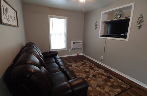 it was just remodeled with brand new paint throughout, a new central heating and air hvac unit, new bedding, new flooring, and leather dual-reclining sofa in the living room This rental includes a complete kitchen with all of the necessities, from pots and pans down to silverware, and a full-size stove & refrigerator, and charcoal grill for your use on your private, covered, back patio! We have supplied everything down to the hangers to hang your clothes on inside of full-sized closets with dressers in both bedrooms. There is a TV in the living room and one of the bedrooms, with a DVD player at each TV to watch your favorite Red Box movies on.