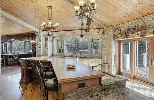 inside, the main house welcomes you with an open layout bathed in natural light The home is equipped with modern amenities including Wi-Fi, a washer and dryer, and central AC. The living spaces seamlessly flow from the living room to an expansive dining room, perfect for hosting large dinners. The gourmet kitchen, equipped with a coffee maker and top-of-the-line appliances, overlooks the mesmerizing lake. Additional comforts include a cozy fireplace, multiple sitting areas, work-from-home space, and easy access to the back patio. The lake house and pool house cottage, each with a small kitchen and living room, offer more intimate settings and privacy, with the latter featuring a pool table. The second lake-front guest cottage adds to the charm of this magnificent property with an additional private kitchenette.
